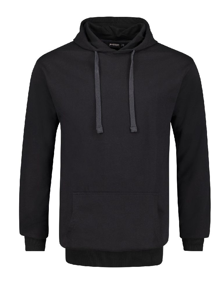 Schwarzer Kapuzenpullover aus 100 % Baumwolle mit Kapuze und Kängurutasche für einen trendigen Look. Elastische Bündchen an Ärmeln und Saum. ILT13283