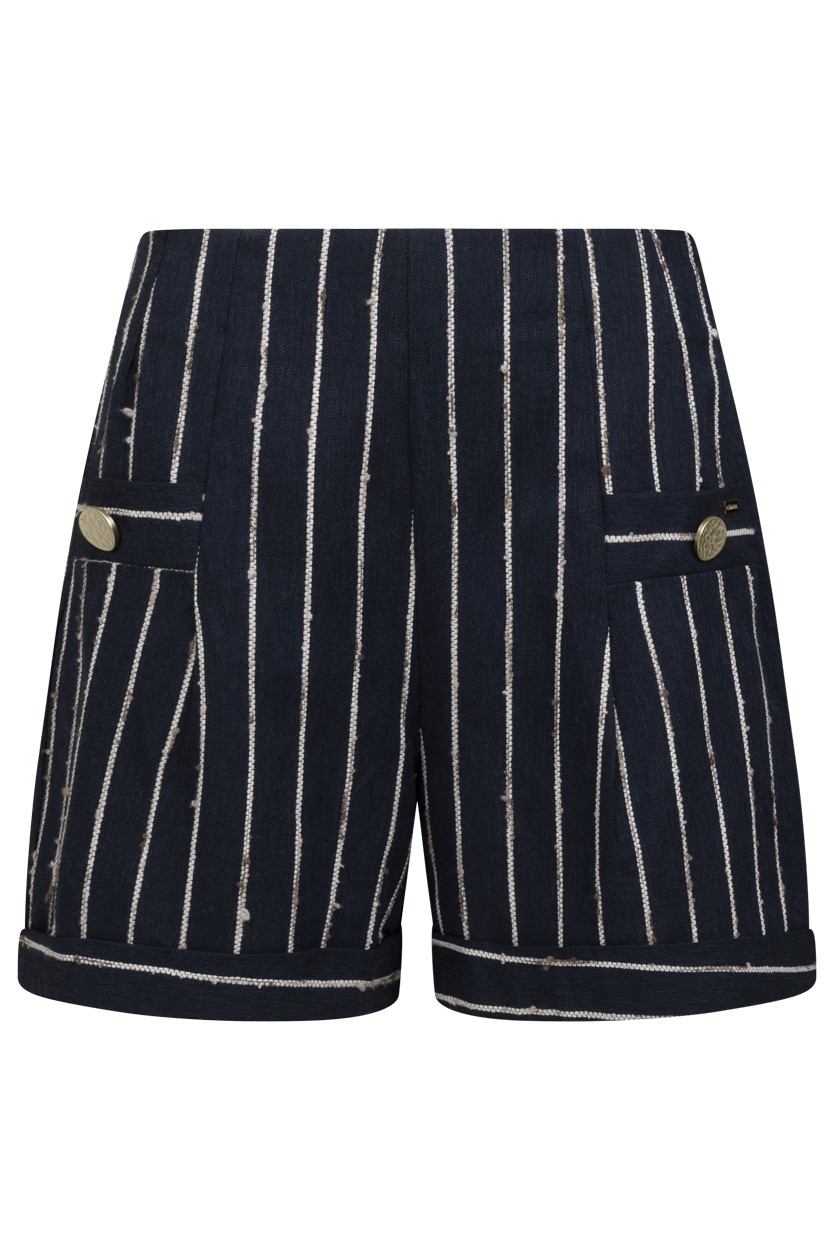Elegant pinstriped shorts made from a soft poly-viscose blend. Gold button details and a rolled-up hem create a modern, summery look. Paired with the Vento blazer, they form a striking, elegant ensemble that’s perfect for spring and summer and can be worn both casually and smartly.