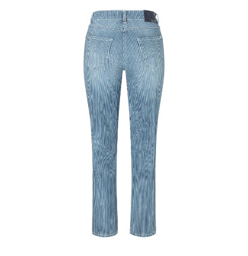 Le jeans Melanie de MAC fait toujours bonne figure. Ici en rayures minimales estivales sur le jean bleu. Ici dans les longueurs extra longues L34 inch & L36 inch, parfaites pour les femmes de grande taille.